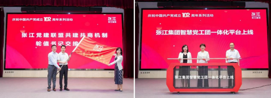 張江黨建聯(lián)盟第三屆輪值書(shū)記交接儀式(左)、張江集團(tuán)智慧黨工團(tuán)一體化平臺(tái)上線(右)