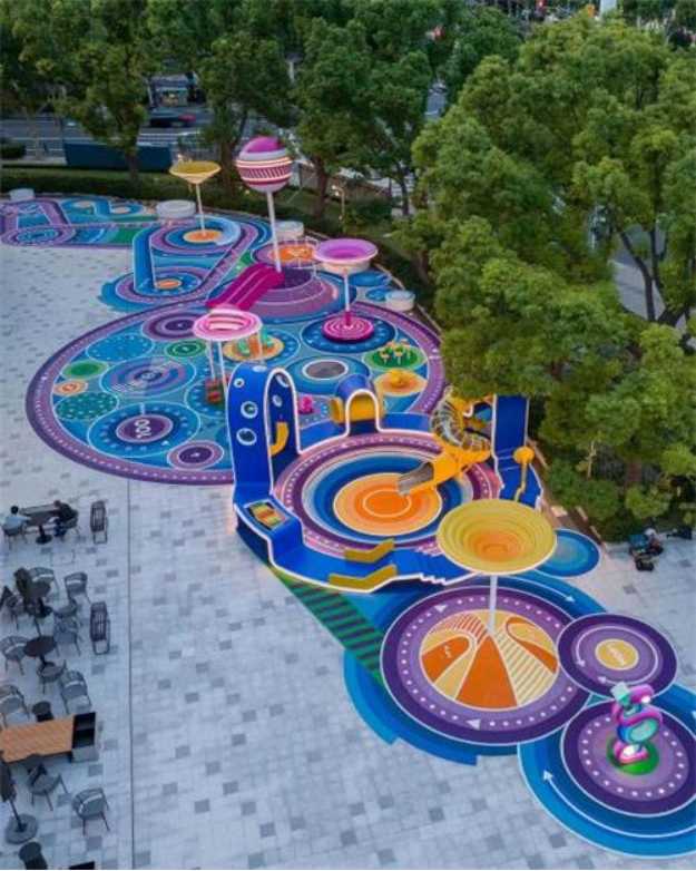 陸家嘴集團(tuán)立足于“兒童友好”理念,以想象中的“糖果世界”為靈感的項(xiàng)目,借助糖果手杖、棒棒糖、冰棍等兒童喜愛的糖果主題,搭建了一條條亮眼且生動的彩虹結(jié),通過巧妙結(jié)合現(xiàn)場的L形地形,不僅承載著多元的游戲活動,而且互相交錯,蜿蜒穿插形成了一系列互動性、可玩性、娛樂性極高的游玩動線。無論是1歲左右的嬰幼兒,還是14歲步入青春期,不同年齡段的孩子都可以輕松在這里找到愉快且富有挑戰(zhàn)性的游戲項(xiàng)目。