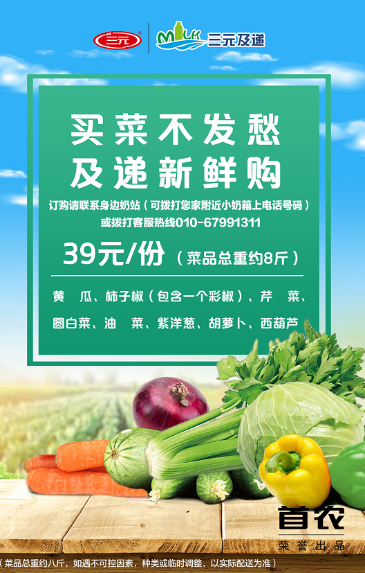 送菜服務(wù)是奶站為解決居民買菜困難而啟動的短期業(yè)務(wù)。不光是訂奶戶,奶站服務(wù)覆蓋的小區(qū)居民只要有需求,都可以選擇訂菜。居民訂購可撥打自家附近小奶箱上的電話號碼與周邊奶站聯(lián)系,或撥打客服熱線010-67991311進(jìn)行預(yù)訂。