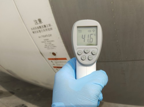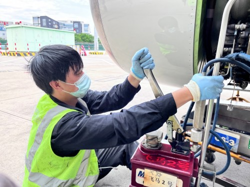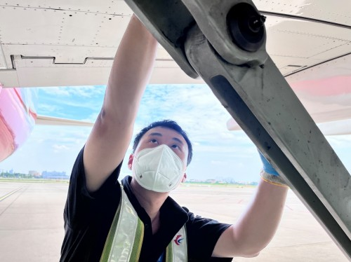 擦拭飛機(jī)起落架鏡面是航線保障中很尋常的一項(xiàng)工作,但由于今天外部氣溫較高,吸油棉接觸飛機(jī)鏡面后,東航機(jī)務(wù)員工的手心瞬間感覺(jué)炙熱