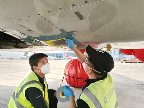 由于溫度較高,機(jī)務(wù)人員細(xì)心地檢查封存膠帶的粘性,避免由于高溫軟化或脫膠,以及對(duì)飛機(jī)表面產(chǎn)生腐蝕。雖然在機(jī)腹陰涼處,兩位機(jī)務(wù)小伙還是感覺(jué)層層熱浪