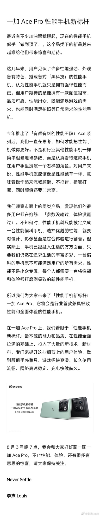 一加 Ace Pro定位“性能手機新標桿”, 一加中國區(qū)總裁李杰表示不知何時,性能手機就只能被定義為一臺性能偏科手機,選擇優(yōu)越的性能,就要對設計、影像甚至是綜合體驗進行割舍。李杰稱:每個人都需要一臺將性能和體驗都打磨到極致的新性能手機。性能手機新標桿一加 Ace Pro,將會是行業(yè)首款兼具極致性能和全面體驗的性能手機。