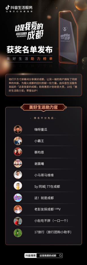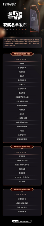 2022年11月4日,由抖音生活服務(wù)發(fā)起的「這是我愛的成都」助商惠民計劃收官大賞,以一場「這是我愛的成都·美好生活助力榜單」榮譽發(fā)布,對活動期間為成都播撒生活美好的30個品牌和10位達(dá)人做出總結(jié)與嘉獎。