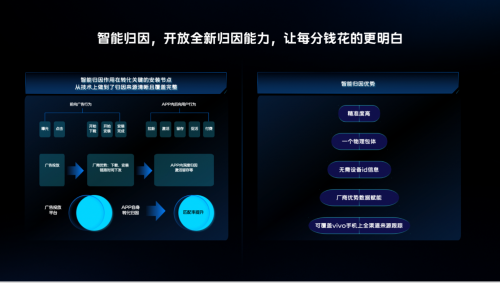 其中一個新的亮點是智能歸因能力升級。智能歸因作為不依賴于設(shè)備ID的系統(tǒng)級服務(wù),在把握APP不同生命周期的基礎(chǔ)上結(jié)合用戶生命周期特點,以vivo全域效果優(yōu)化視角為客戶提供生態(tài)全域增長服務(wù),呈現(xiàn)更全面的用戶行為鏈路,共創(chuàng)更多營銷可能性。