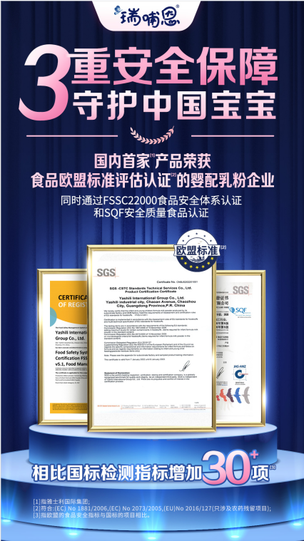 秉承“消費(fèi)者第一第一第一”的企業(yè)價(jià)值觀,蒙牛瑞哺恩對標(biāo)全球最嚴(yán)標(biāo)準(zhǔn),全面啟動(dòng)歐盟標(biāo)準(zhǔn)升級,憑借著高標(biāo)準(zhǔn)、嚴(yán)要求,瑞哺恩國內(nèi)4家工廠均順利拿下國際權(quán)威認(rèn)證機(jī)構(gòu)SGS授予的歐盟食品標(biāo)準(zhǔn)認(rèn)證,蒙牛瑞哺恩更成為國內(nèi)首款通過食品歐盟標(biāo)準(zhǔn)評估認(rèn)證的嬰配乳粉產(chǎn)品,同時(shí)還獲得SGS授予的FSSC2200食品安全體系認(rèn)證和SQF食品安全質(zhì)量認(rèn)證,代表著蒙牛瑞哺恩旗下的嬰幼兒配方奶粉的生產(chǎn)已達(dá)到國際一流水平。