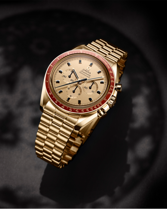 在1969這個(gè)重要年份里,除了隨宇航員登上月球的款式之外,還有一枚非常特殊的超霸表。在當(dāng)年慶祝登月成功的晚宴上,歐米茄捧出了一款黃色18K金限量超霸腕表:金色表盤,勃艮第紅色鋁制表圈,鍍黑指針與時(shí)標(biāo),這是第一枚貴金屬超霸。