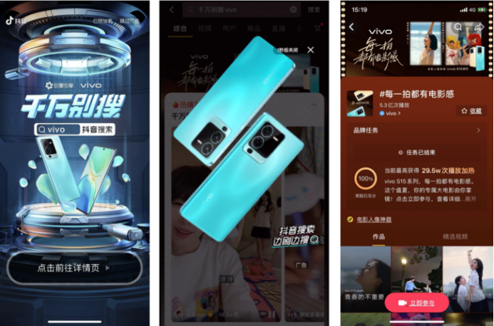 例如,在「千萬別搜」第一季中,vivo便通過兼具時(shí)尚感與科技感的創(chuàng)意開屏激發(fā)用戶點(diǎn)擊興趣,讓用戶通過點(diǎn)擊一鍵直達(dá)熱點(diǎn)品專并彈出彩蛋承接用戶興趣,進(jìn)一步聯(lián)動(dòng)#每一拍都有電影感話題轉(zhuǎn)化經(jīng)營(yíng)——通過這條完整的路徑,vivo實(shí)現(xiàn)話題頁(yè)5.3億曝光、全民任務(wù)播放量超穩(wěn)定播放區(qū)間最高值1.8倍的超預(yù)期佳績(jī)。