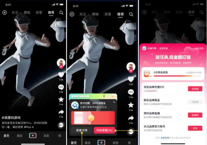 在產(chǎn)品價(jià)值的深度種草上,“答題種草”是一種新解法:在種草視頻講解過(guò)程中,前置答題/競(jìng)猜活動(dòng)利益點(diǎn),激發(fā)用戶互動(dòng);品牌設(shè)定的問(wèn)題,可與種草素材深度綁定,突出產(chǎn)品賣(mài)點(diǎn)和價(jià)值;答題互動(dòng)后,用戶即有機(jī)會(huì)獲得激勵(lì),完成品牌額外定制任務(wù),讓現(xiàn)金獎(jiǎng)勵(lì)膨脹10倍。