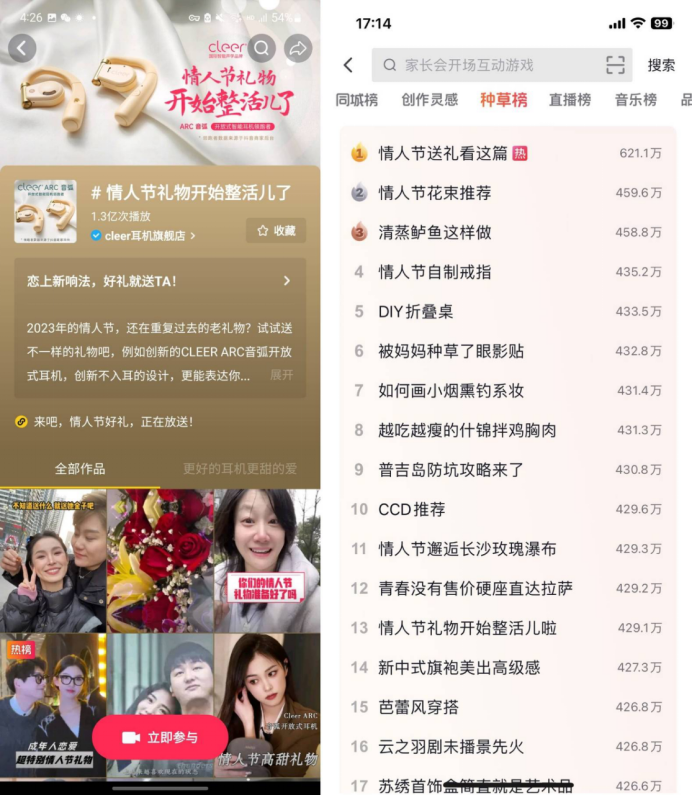在情人節(jié)期間,Cleer耳機(jī)打造#情人節(jié)開(kāi)始整活了#熱點(diǎn)話題營(yíng)銷(xiāo),帶動(dòng)不同層級(jí)的達(dá)人共創(chuàng)內(nèi)容,形成高熱話題,鼓勵(lì)用戶一起來(lái)“接?!薄巴婀!?#xff0c;在全民“追熱點(diǎn)”的過(guò)程中,全面引爆了品牌種草熱度。數(shù)據(jù)顯示,話題最終登陸種草榜13位,曝光達(dá)1.3億。