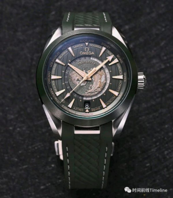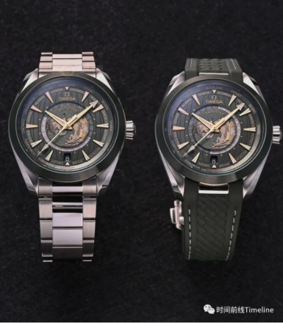 這款世界時(shí)的細(xì)節(jié)在于,內(nèi)表盤的海洋顏色與手表配色一致,鈦殼是灰色、鋼殼是綠色;陸地則采用激光技術(shù)進(jìn)行著色,金色是高海拔地區(qū)。其中鈦金屬表盤的黑灰色都是由激光歐米茄的地圖是以北極為中心的北半球,我們可以注意到,地圖帶有微微的弧形效果,模仿了真實(shí)的地球曲率。盤面上帶地圖的表不少,但像歐米茄做的這么細(xì)致真實(shí)的,極少。