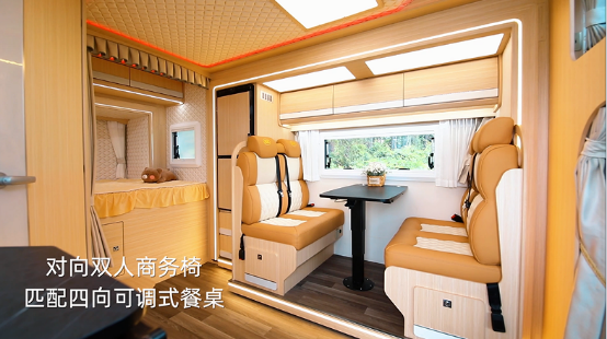 踏入房車內(nèi)部,菱形金絲縫線軟包車頂配合淺木紋飾面家具,目光所至,皆是精致歐系風(fēng)尚,品味盡顯。寬敞舒適的空間布局,帶來家的溫馨氣息。廚房設(shè)備齊全,休閑區(qū)配備多人卡座、可升降桌臺(tái)、JBL揚(yáng)聲器及智能網(wǎng)絡(luò)電視等,帶來美食+娛樂疊加的趣味。