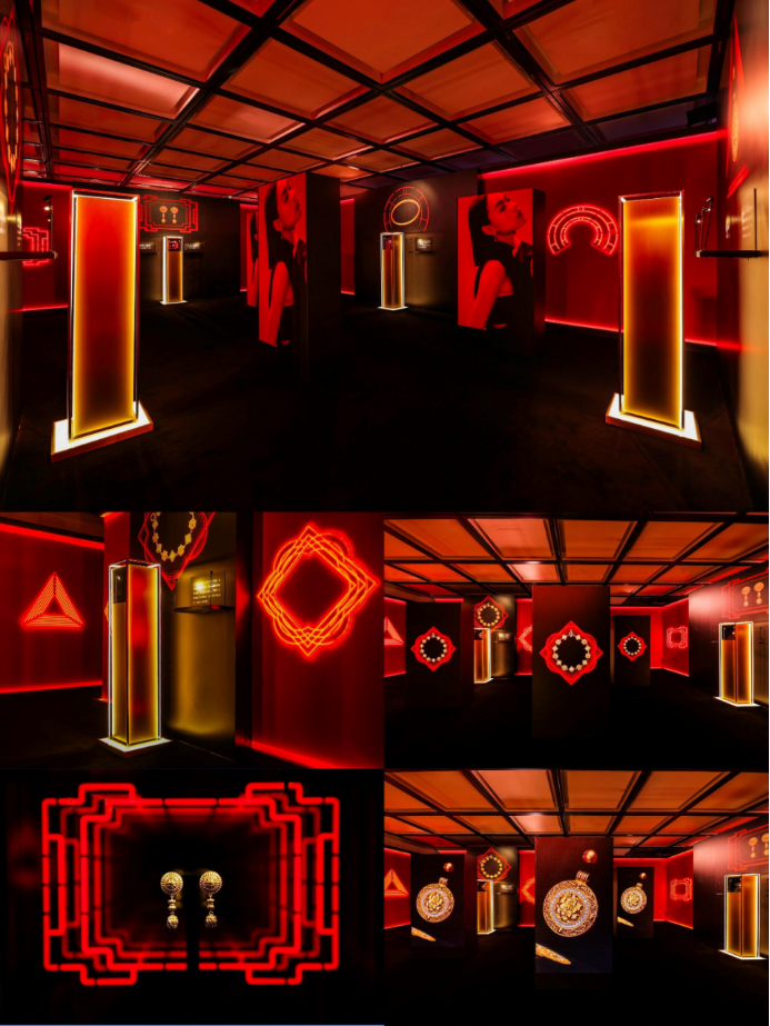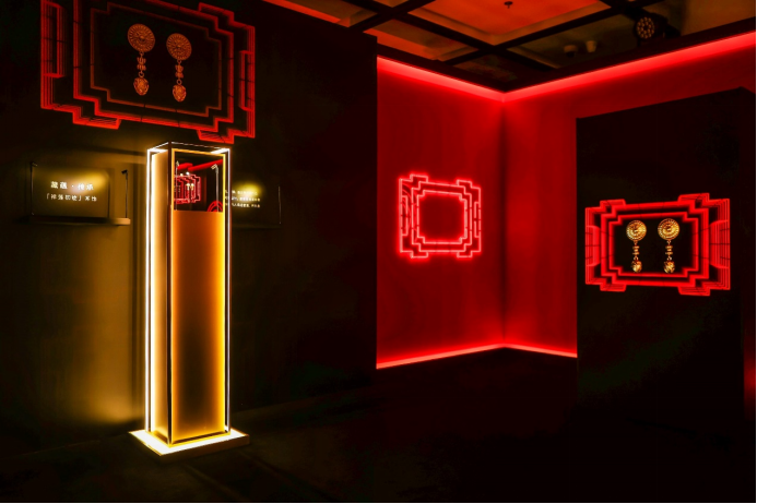 博大精深的中國傳統(tǒng)文化孕育出無限創(chuàng)造力和想象力,因此周大福珠寶集團在探索珠寶美學與中國傳統(tǒng)文化相結合的過程中不斷推陳出新,呈獻許多匠心獨運的藝術臻品——標志性的周大福傳承系列作品。此次GOLD IS CHIC鎏光時代·周大福傳承系列黃金美學藝術展跨越時空界限,將蘊含歷史、文化的黃金美學呈現(xiàn)到大眾視野中,全方面展現(xiàn)黃金珠寶設計背后的時尚創(chuàng)意靈感、精益求精的工藝和具有東方韻味的藝術美學理念。此次展覽的空間設計從周大福傳承系列視覺大片中汲取靈感,衍生出紅黑金三色、光影不斷變換、又極富想象力的三個空間,以創(chuàng)新的藝術視角展現(xiàn)品牌具有中國傳統(tǒng)文化內涵的時尚潮流形象。置身于展覽空間,映入眼簾的是霓虹線條與迷離燈光相互交織而成的“時光隧道”,使人仿佛置身于過去與未來的交界地。光影流動的變幻間,映照出品牌歷經(jīng)歲月沉淀后的璀璨輝煌,這意味著品牌正開啟黃金世代的嶄新篇章。