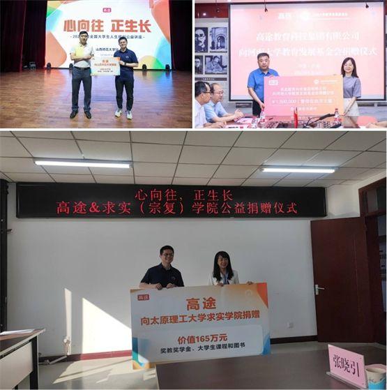 為幫助引導(dǎo)當(dāng)代大學(xué)生樹(shù)立正確的學(xué)習(xí)觀和就業(yè)觀,增強(qiáng)職業(yè)生涯規(guī)劃意識(shí),培養(yǎng)創(chuàng)新創(chuàng)業(yè)思維,保持奮發(fā)昂揚(yáng)向上的精神狀態(tài)。6月12日到15日,高途先后向山西師范大學(xué)、太原理工大學(xué)、河南大學(xué)、武漢理工大學(xué)四所大學(xué)捐贈(zèng)了總價(jià)值超過(guò)600萬(wàn)元的課程書和書籍,支持在校大學(xué)生學(xué)習(xí)提升。同時(shí)高途在山西師范大學(xué)、太原理工大學(xué)設(shè)立了連續(xù)三年的“獎(jiǎng)教獎(jiǎng)學(xué)金”,用于獎(jiǎng)勵(lì)有突出貢獻(xiàn)的教學(xué)項(xiàng)目和表現(xiàn)優(yōu)異的在校大學(xué)生。