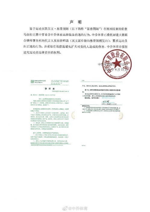 賽后,中喬體育發(fā)出官方聲明,要求運(yùn)動(dòng)員糾正違約行為并寄出律師函。據(jù)悉,Kelvin Kiptum (凱爾文·基普?qǐng)D姆)于今年3月8日正式成為中喬體育品牌代言人,中喬體育通過官方渠道釋放了這一訊息。在賽前一系列訓(xùn)練,Kelvin Kiptum (凱爾文·基普?qǐng)D姆)也使用中喬體育的運(yùn)動(dòng)產(chǎn)品,但在倫敦馬拉松正式比賽上卻公然違約,這一行為在網(wǎng)絡(luò)上引發(fā)熱議。在社交媒體上,眾多體育愛好者表示憤慨,并支持中喬體育合理維權(quán),事件的后續(xù)發(fā)展受到體育圈層的廣泛關(guān)注。