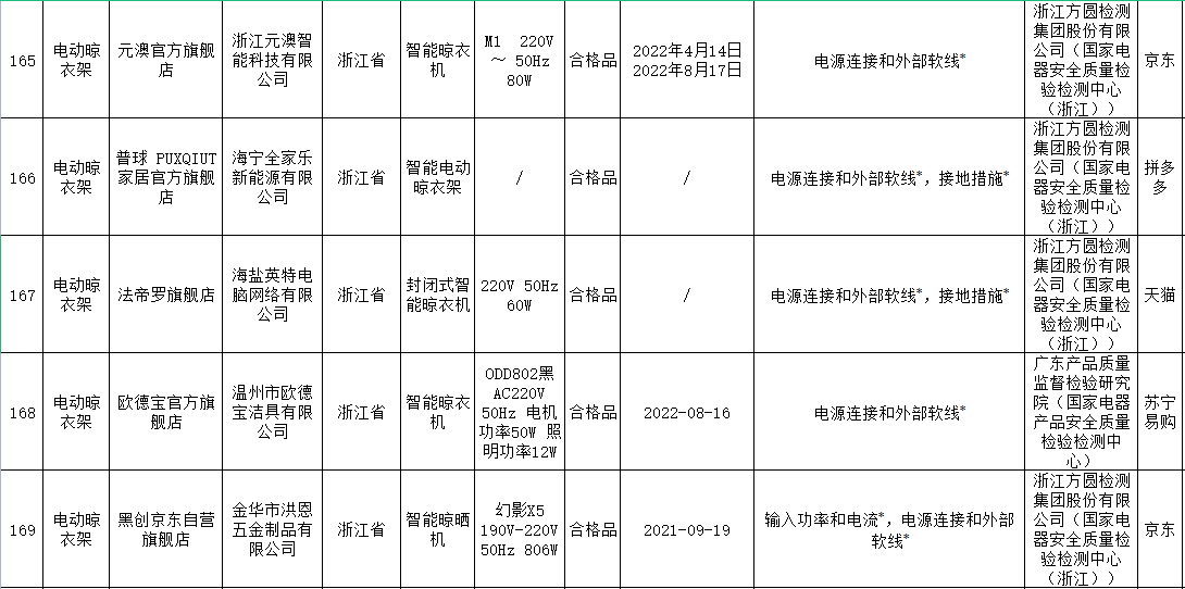 無獨(dú)有偶,據(jù)上海市市場監(jiān)督管理局發(fā)布的2022年上海市產(chǎn)品質(zhì)量監(jiān)督抽查結(jié)果(第十批)顯示,11批次智能晾衣架抽查不合格,其中涉及HOTATA好太太、美時美克EMOED、南極人等品牌。